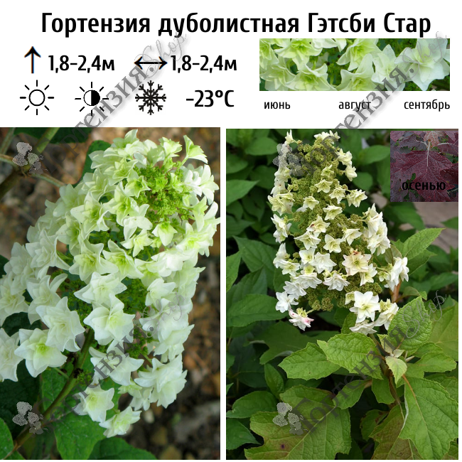 Дуболистная гортензия ‘Гэтсби Стар’— настоящая звезда! Крупные белые цветки-метелки красиво контрастируют с темно-зелеными листьями в форме дубовых листьев и покрыты красивыми звездчатыми махровыми соцветиями. Лепестки, расположенные друг над другом и заострённые на концах, придают соцветию кружевную текстуру — нежную, замысловатую и наполненную соцветиями. Центры цветков кремово-зелёные. Каждый цветок состоит из четырёх слоёв чашелистиков. Осенью цветы приобретают красивый оттенок розового, а листья становятся блестящими винно-красными. Листья,в отличие от всех остальных гортензий, не цельные, а 3—7-лопастные, похожие на листья дуба, откуда и произошло видовое название .
