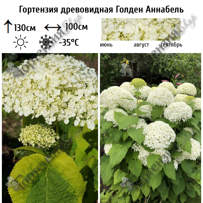 Гортензия древовидная Голден Аннабель —  Эффектная древовидная гортензия с огромными белыми цветами в щитках, обильно цветет с июня по сентябрь. Растение очень разветвленное, с опушенными ветвями и соцветиями. Листья опадающие, овальные, около 10 см, зеленые с желтой каймой, на длинных черешках -невероятно декоративны весь сезон. Цветёт Золотая Аннабель очень обильно на побегах текущего года и на прошлогодних побегах с июля по сентябрь. Огромные пышные соцветия собраны из множества стерильных цветков диаметром около 2 см, в начале цветения лимонно-зеленоватых, затем молочно-белых. Куст Голден Аннабель в цвету - ослепительное зрелище! Короткая весенняя обрезка обязательна. Зимостойкость до -29 градусов, в зоне средней полосы требуется укрытие на зиму. Предпочитает солнечные участки, но может расти и в полутени.  Переносит более нейтральные почвы, рН 5,5-6 чем другие гортензии. В сезон почва всегда должна быть от прохладной до влажной. Подходит для бордюрных посадок,  миксбордера, одиночная и групповая посадка.