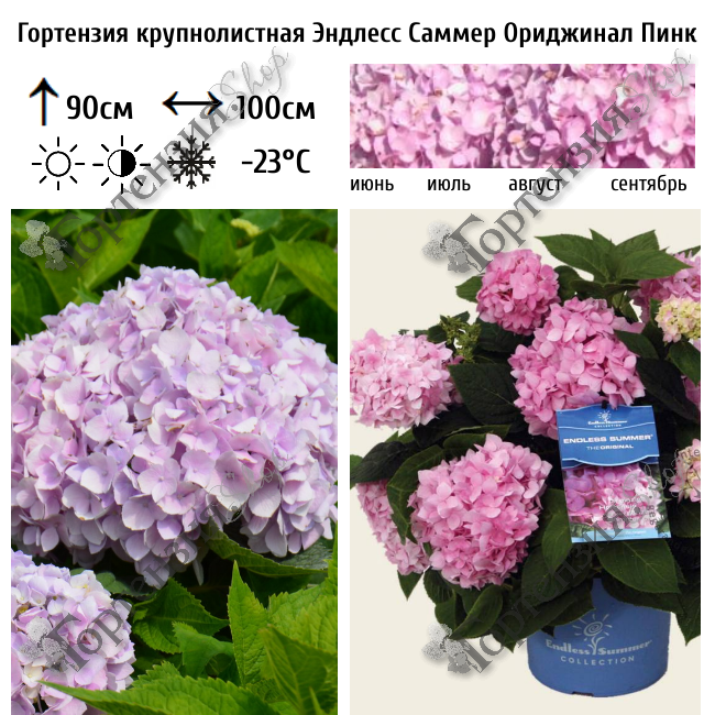 Гортензия крупнолистная Endless Summer ® The Original Pink - первый из сортов гортензии в коллекции. Цветет на одревесневших стеблях прошлого года и на ростках нового сезона. Выносливая, устойчивая к болезням и проверенная временем гортензия.   Original  может цвести как привлекательная голубая гортензия ИЛИ розовая гортензия, при необходимости регулируя уровень pH почвы. Куст средних размеров – 90-110 сантиметров, с широкой кроной. Стебли прочные, ветвистые с большим количество листвы насыщенного зеленого цвета. Период цветения – июнь-сентябрь. Яркие розовые крупные цветочки собраны в плотные шаровидные соцветия. При обрезке после первого цветения растение зацветет повторно. Сорт желательно располагать на солнце либо полутени, на влажных почвах с хорошим дренажом. На зиму требует укрытия.