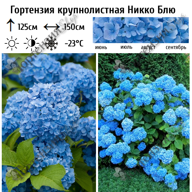 Цветущий листопадный кустарник высотой до 1,2 см и шириной до 1,5 м. Цветки розовые, голубые, или синие соцветиях диаметром до 15 см. При выращивании в нейтральной или щелочной почве цветки будут розовыми, при выращивании в кислой почве будут медленно голубеть. Цветение в благоприятных условиях обильное, длительное. Побеги прочные, толстые. Идеально подходит для сада, террасы или балкона. Место солнечное утром и/или вечером и полутенистое - в полдень. Почва влажная, дренированная. На зиму требует укрытия или заноса контейнеров в неотапливаемое помещение с целью сохранения цветковых почек. Зона 5 (до -29С)..