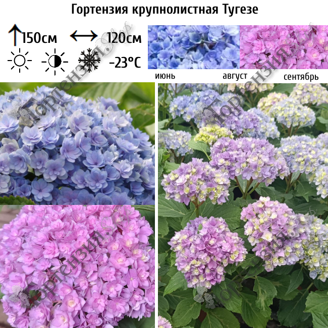 Гортензия крупнолистная Тугезе (из серии «You & Me») - очень красивый обильноцветущий сорт. Компактная, с густой кроной и крупной листвой высотой до 150 см.Изящные очень крупные, махровые соцветия состоят из многорядных звездочек, в начале распускания зеленоватые, затем розовые или голубые тона (в зависимости от кислотности почвы), а в полном роспуске и по мере вегетации приобретают  более насыщенные красные или фиолетовые оттенки. Цветет на побегах прошлого и текущего года, с июня и до наступления заморозков.Морозостойкость 5 зона  (до -23°С). требует укрытия на зиму.
