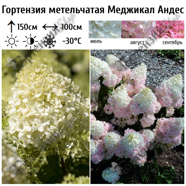 Гортензия метельчатая Меджикал Андес компактный цветущий кустарник. Высота куста до 150 см, ширина до 100 см. Листья зеленые, побеги красные крепкие. Цветет с июля по сентябрь. Соцветия большие конические в начале цветения кремово-лаймовые, позже белые, со временем становятся розовыми, некоторые стерильные, а некоторые фертильные. Почва должна быть кислая, влажная, но без застоя воды. Зимостойкость-30С. Используется для миксбордеров, небольших садов, и контейнерного выращивания.