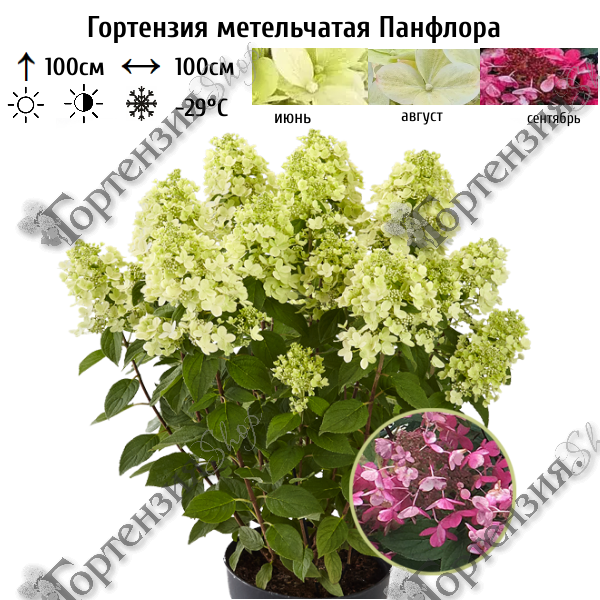 Гортензия сорта Panflora --- эксклюзивная серия патио немецкой селекции PAN. Красивая аккуратная гортензия высотой до 100 см. Прочные, разветвленные и крепкие побеги, обильно покрытые листвой темно-зеленого цвета.