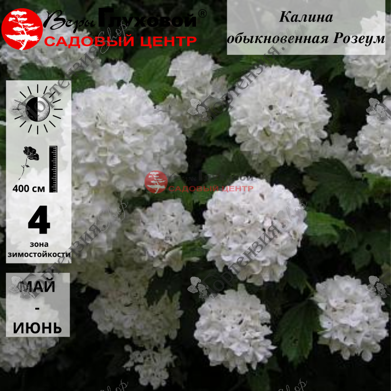 Калина обыкновенная 'Розеум' Viburnum opulus 'Roseum' -листопадный крупный раскидистый кустарник, высота до 7 м диаметр кроны до 4 м. Живет более 50 лет. листья кленовидные зеленые. Цветки белые, мелкие собраны в шаровидные соцветия диаметром до 10 см цветет в июне. К почвам не требовательна. Морозостойкость -34С