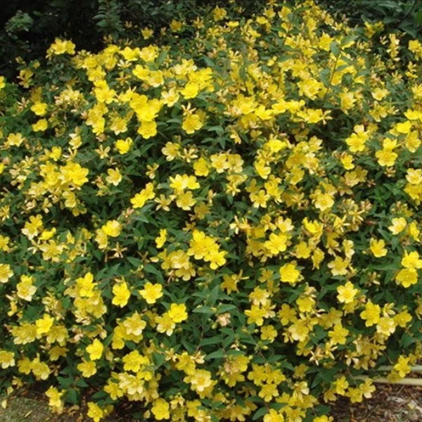 Зверобой Хидкот (Hypericum Hidcote) - многолетний полувечнозеленый кустарник до 1,5 м. в высоту и до 100 см в ширину. Куст прямостоячий, компактный, очень декоративный. Побеги крепкие, вертикальные. Цветки с пятью лепестками, ярко-желтые, с пушистыми тычинками. Лист темно-зеленый. Цветение с июня по октябрь. Зверобой хорош для яркого акцента в саду, в парке, среди других растений.