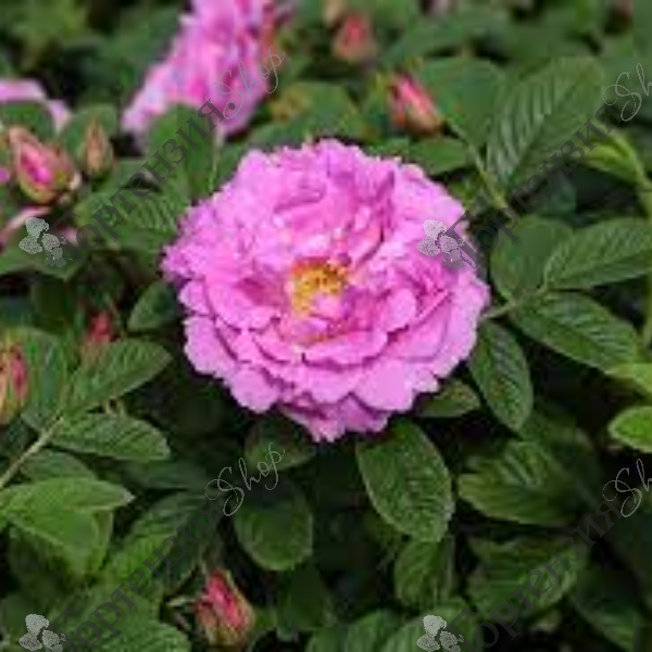Компактное, высота растения 70 - 90 см, ширина куста 80 см, лист мелкий, зеленый, матовый, осенью становится золотисто-желтым. Растение практически не имеет шипов. Цветок  розовый с сиреневым оттенком и ярко желтыми тычинками,  густомахровый, 40 - 60 лепестков в одном цветке, диаметр цветка 5 - 8 см, обладает насыщенным сладким ароматом с пряными нотками. Цветение  очень обильное, повторное, практически непрерывное, продолжительное до конца октября, цветки одиночные или собраны в небольшие соцветия, осенью появляются небольшое количество плодов ярких, оранжево-красных. Почвы плодородные, гумусированные без застоя воды. Морозостойка.