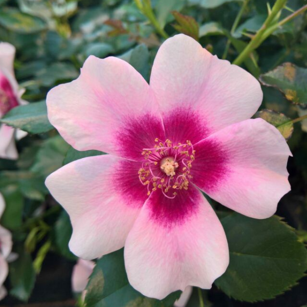 Роза миниатюрная 'Bravo Babylon Eyes' (Rose miniature 'Bravo Babylon Eyes') кустарник c компактной, плотной кроной, высотой до 50 см. Листья жесткие, блестящие. Цветение обильное, продолжительное с июня по октябрь. Цветы розовые с более темным центром, тычинки и пестик выделяются заметно.  Они устойчивы как к жаре, так и к засухе, а также к морозам. Почвы плодородные, дренированные. Сорт серии 'Babylon Eyes'.