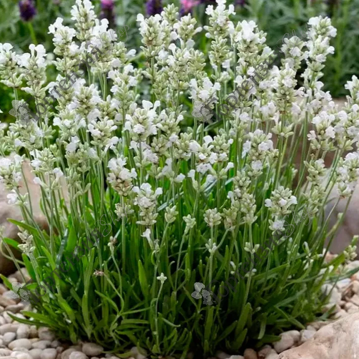 Лаванда узколистная Хидкоте Вайт (Lavandula angustifolia Hidcote White) – многолетнее растение с многочисленными побегами высотой до 50 см, в нижней части деревянистыми. Цветки небольшие, белые, собраны в прерванные колосовидные соцветия. В сочетании с узкими серебристо-зелеными листьями создают приятный аромат. Обладает полезными свойствами. Цветет в июле - августе. Зимостойкое растение. Прекрасно подходит для посадки в миксбордерах, рокариях, пряных садиках.