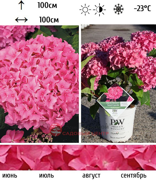 Выносливая и ремонтантная гортензия с сильными ветвями и красивыми туго набитыми цветами ярко-розовыми или сиреневыми, в шаровидных соцветиях. Соцветия-зонтики кружевные, асимметричной формы, диаметром до 20 см. Стерильные цветки полумахровые, розово-красные, в центре кремово-желтые. Соцветия в необычных оттенках от красного до темно-фиолетового цвета появляются на щелочных почвах, в то время как в оттенках синего цвета- на кислых. Цветет все лето, на прошлогодних и новых ветвях. Для поддержания декоративности необходимо удалять отцветшие соцветия. Высота и ширина куста: 80 и 100 см. Растения крепкие и компактные, цветочные шапки очень плотные, крупные. Куст пышный с крупными зелеными листьями высотой до 80 см. Морозостойкость высокая до -25°C. Однако требует укрытия на зиму, чтобы не замерзли почки цветов.